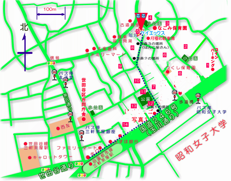 渋谷駅から急行でひと駅(4分)、三軒茶屋駅(駅は世田谷区太子堂にあります。)から徒歩5分ぐらいの合同会社ケイエックスのパソコン教室。待ち時間など入れて、渋谷駅から15分ほどです。